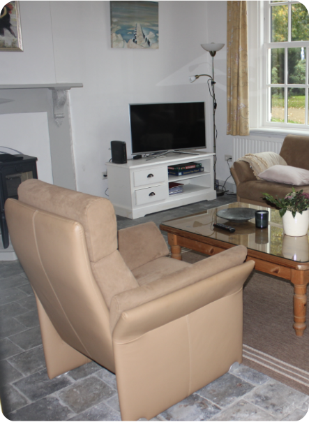 Het huis heeft een ruime eigen tuin, waar onder andere een indrukwekkende oude linde staat. In de tuin kunt u eten, luieren en spelen op één van de fijne plekjes, en genieten van het geluid van de talloze vogels en regelmatig het gezelschap van de damherten. U heeft uitzicht op het groen van het bos, de boomgaard en de bomentuin en vaak hoort u op afstand de branding van de Noordzee.